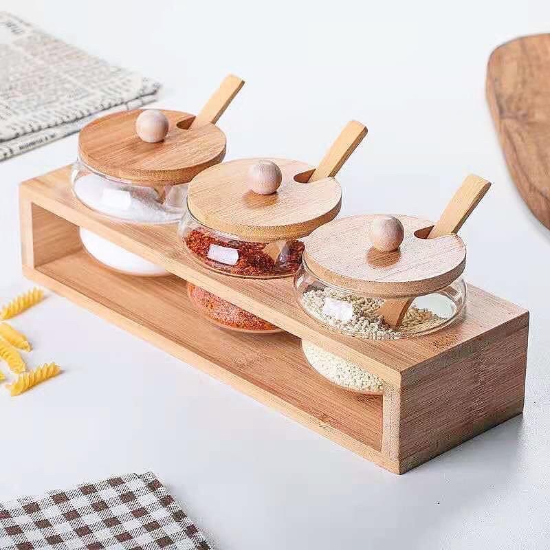 Set de 3 frascos de vidrio con tapa, cuchara y soporte de bambú. Ideal para organizar frutos secos, especias, semillas.