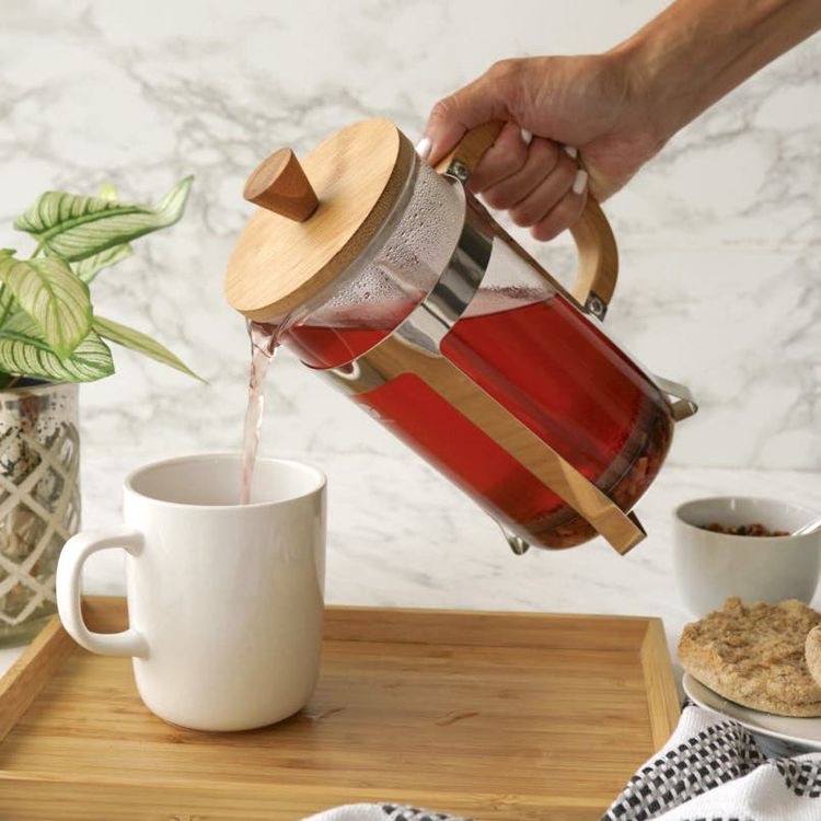 Cafetera de prensa de vidrio borosilicato y estructura de acero inoxidable con tapa y asa de bambú. Sistema de 4 filtros.