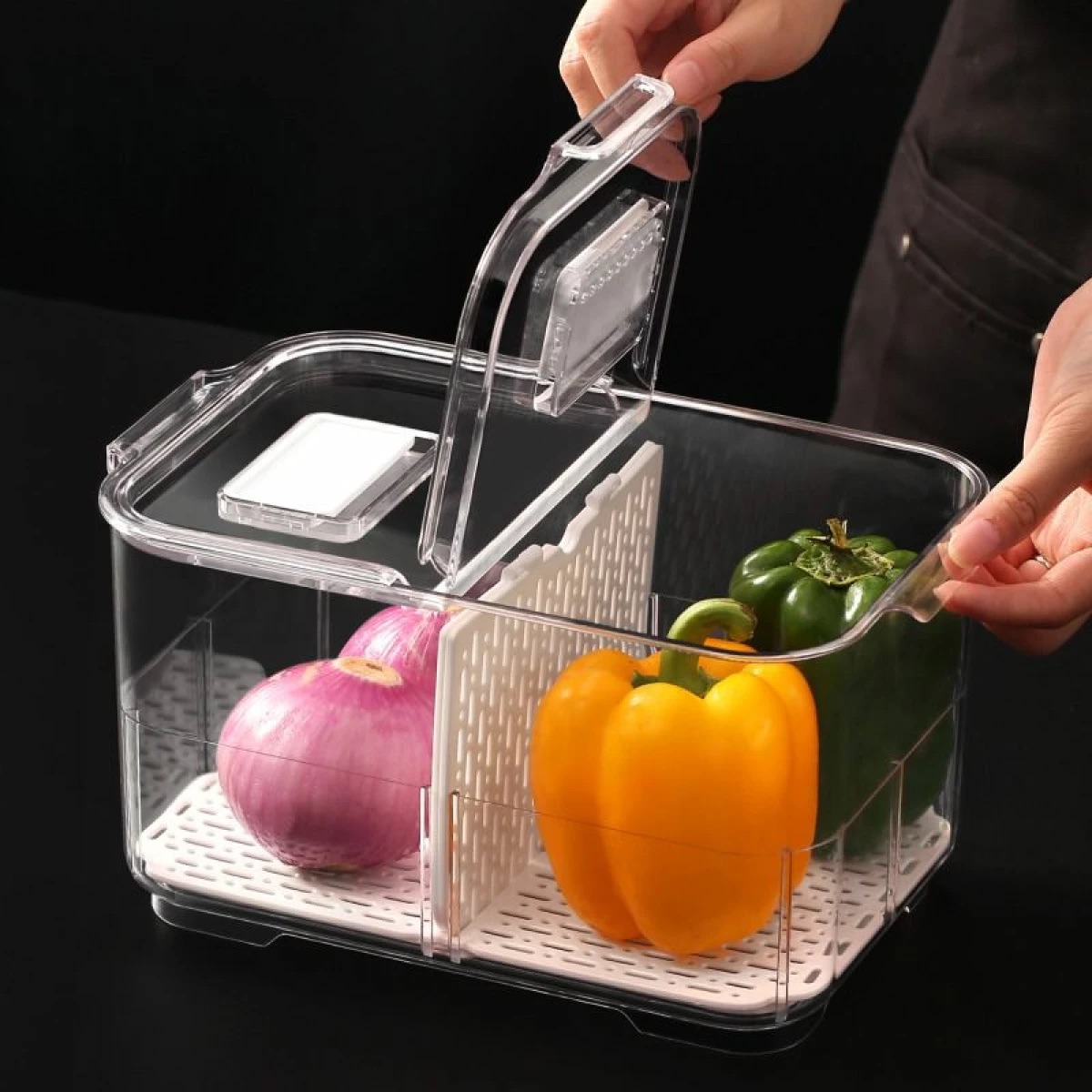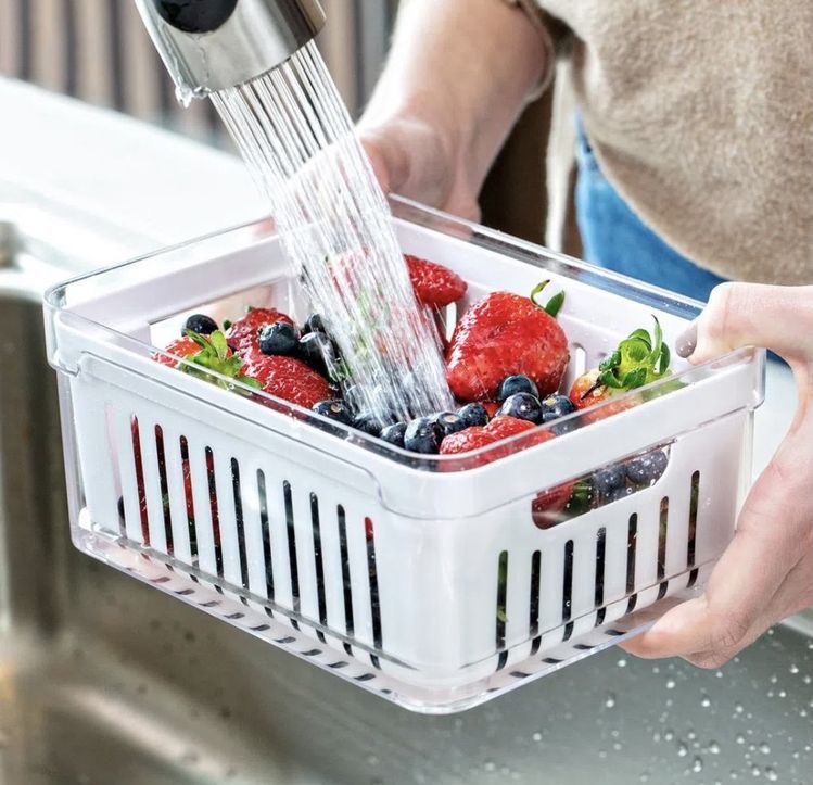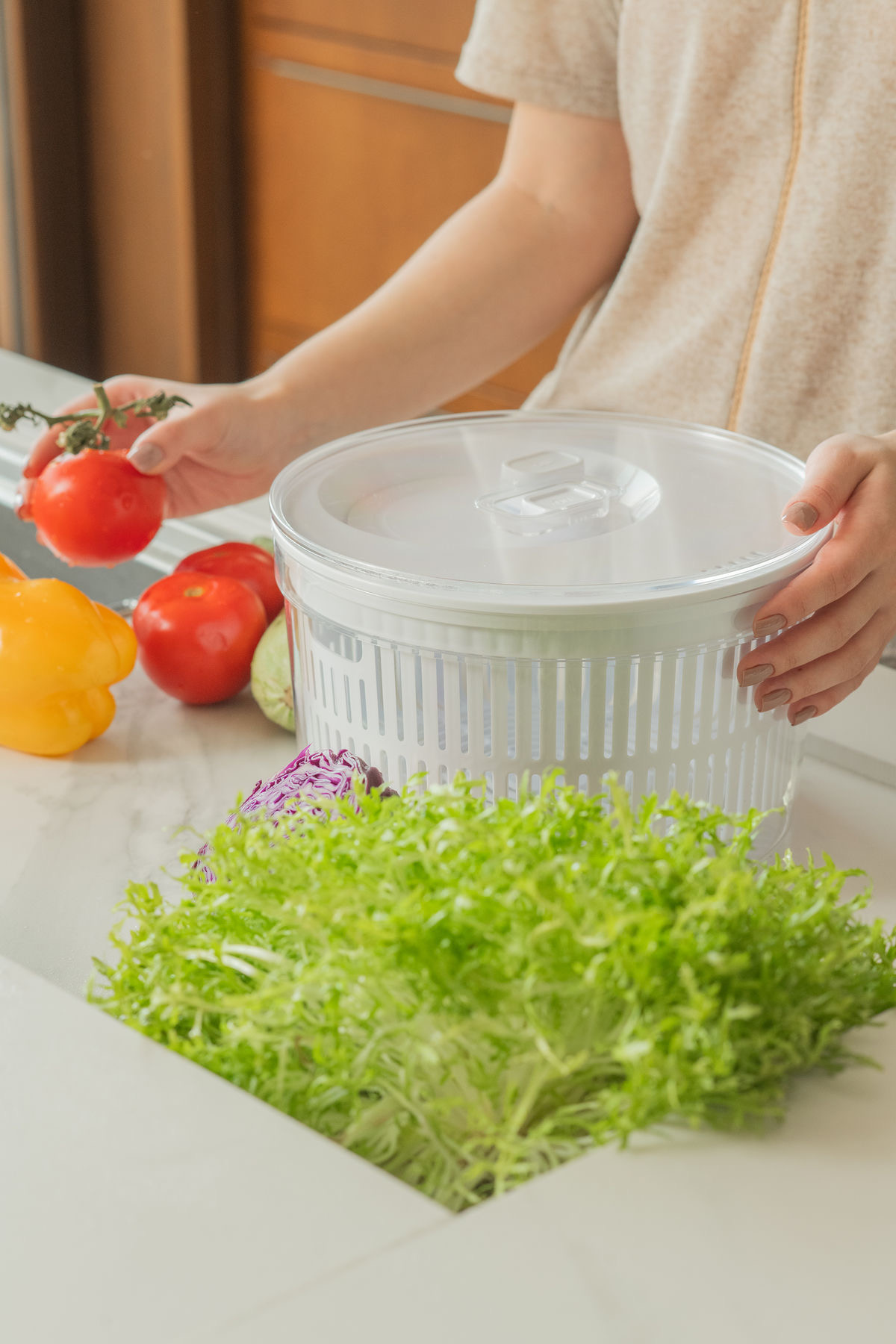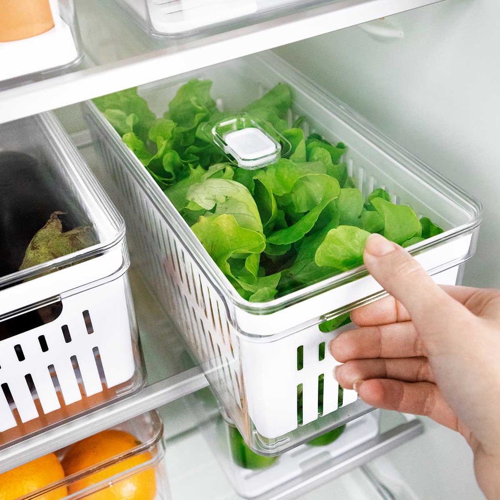 Este organizador limpia y seca las hojas en el mismo lugar. Elimina el agua con sólo unos pocos movimientos. Mantiene las hojas frescas y crujientes por más tiempo. Ensaladas siempre listas para comer. Fabricado con material libre de BPA.