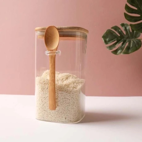 Frasco de vidrio con tapa hermética y cuchara de bambú .