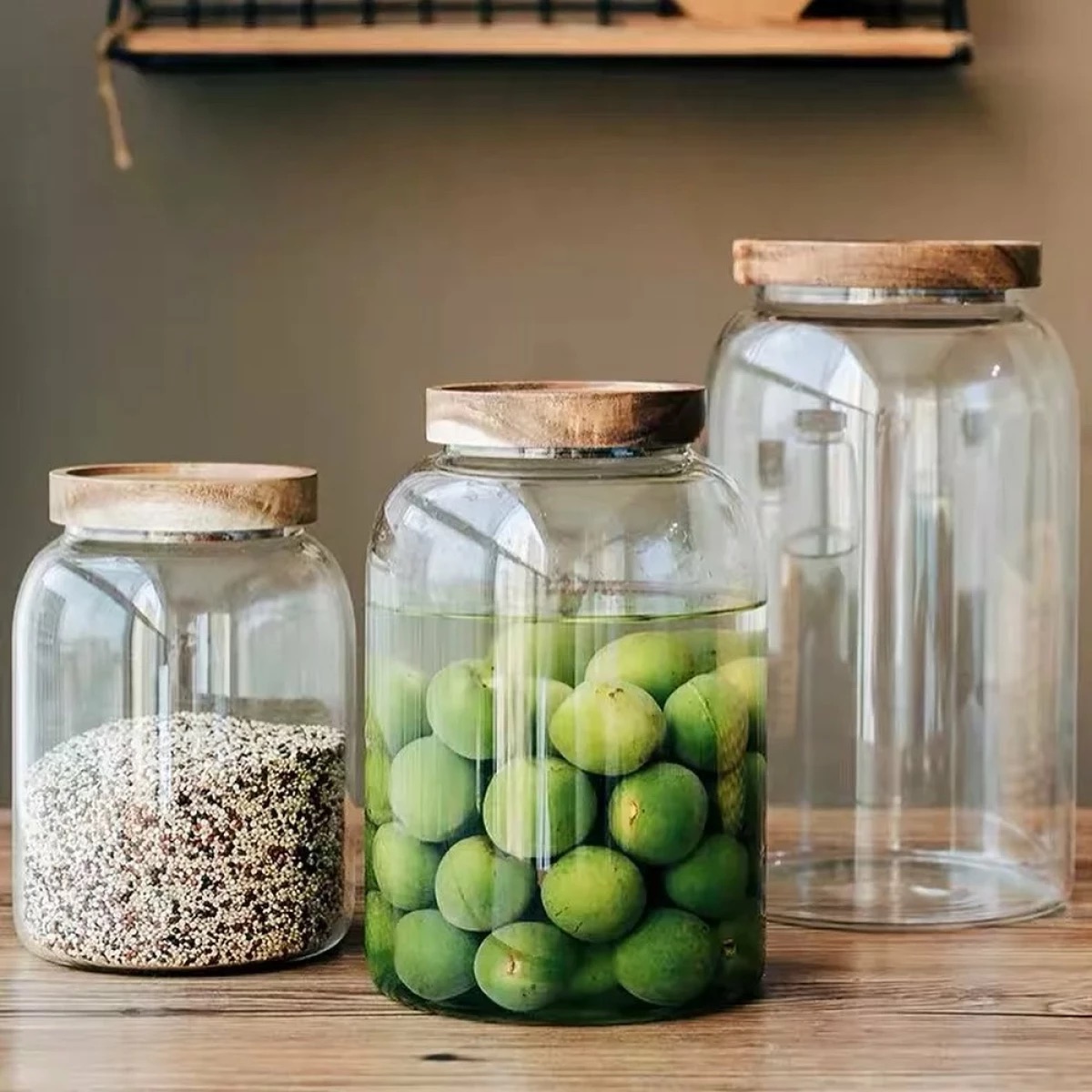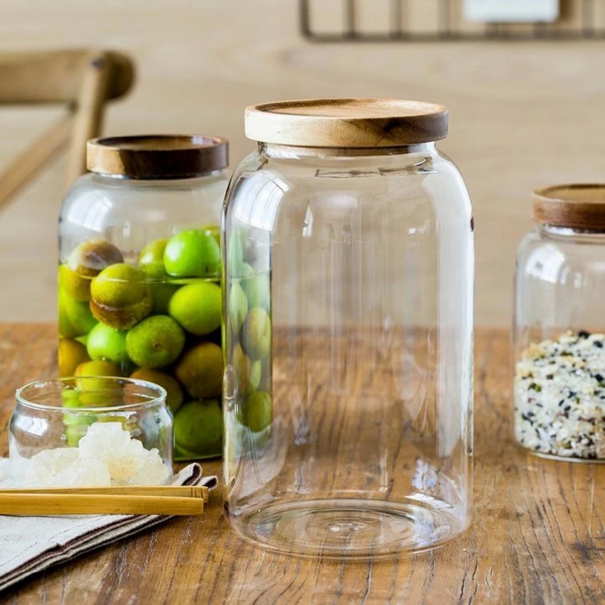 Los frascos p recipientes de almacenamiento Mega están hechos de vidrio de borosilicato. Hecho con alta resistencia, buen rendimiento hermético, resistente al frío y al calor, resistente a ácidos y resistente a la corrosión. Ofrecen una base clara y pulida que contrasta perfectamente con una tapa de madera acacia.