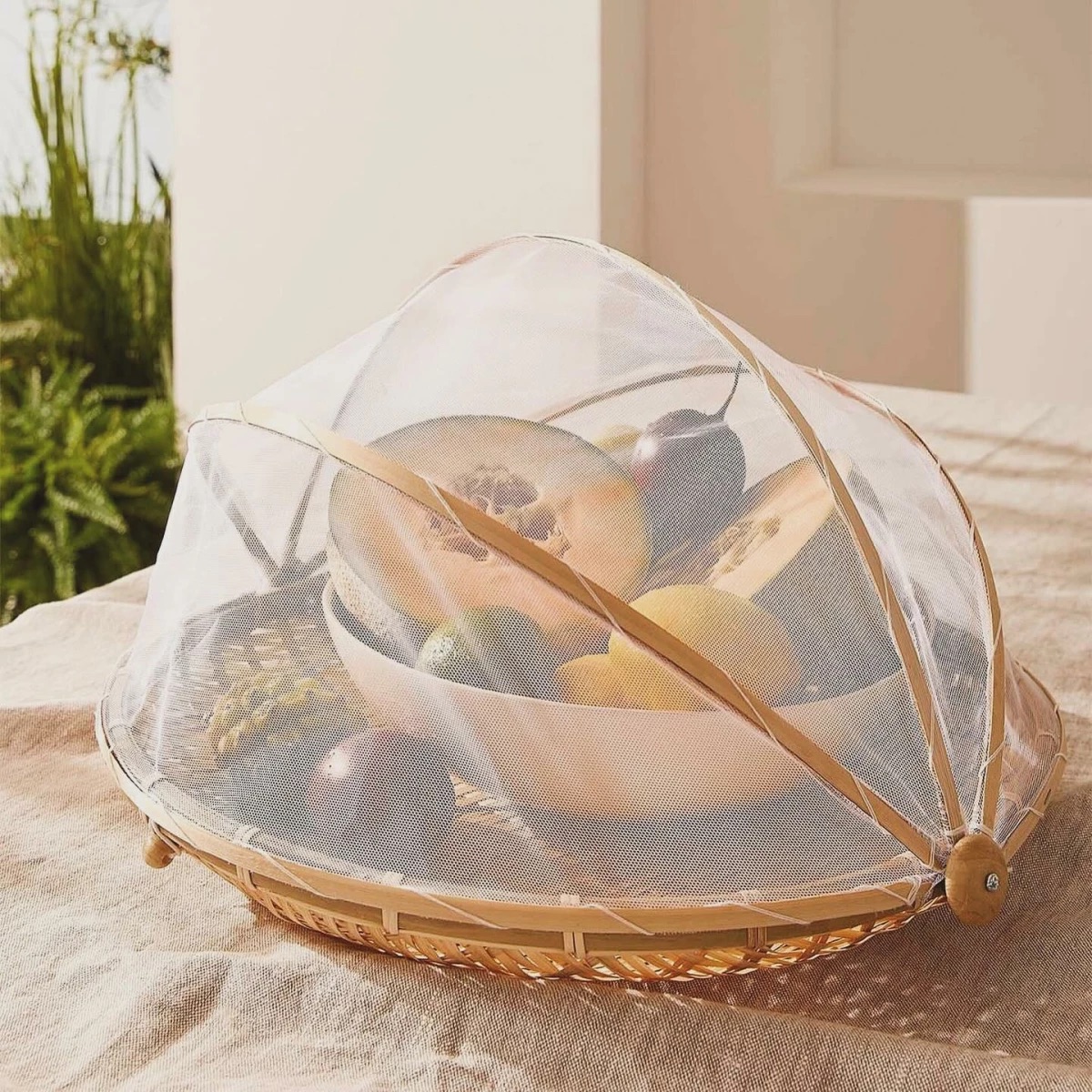 Esta bandeja tejida hecha de materiales naturales (mimbre). Es ecológico, de alta calidad, duradero y sostenible. Bandeja con cobertor tejido ideal para conservar almacenamientos como frutas que requieren estar a temperatura ambiente. La cúpula tejida permite que esté al aire libre y protege de contacto de insectos.