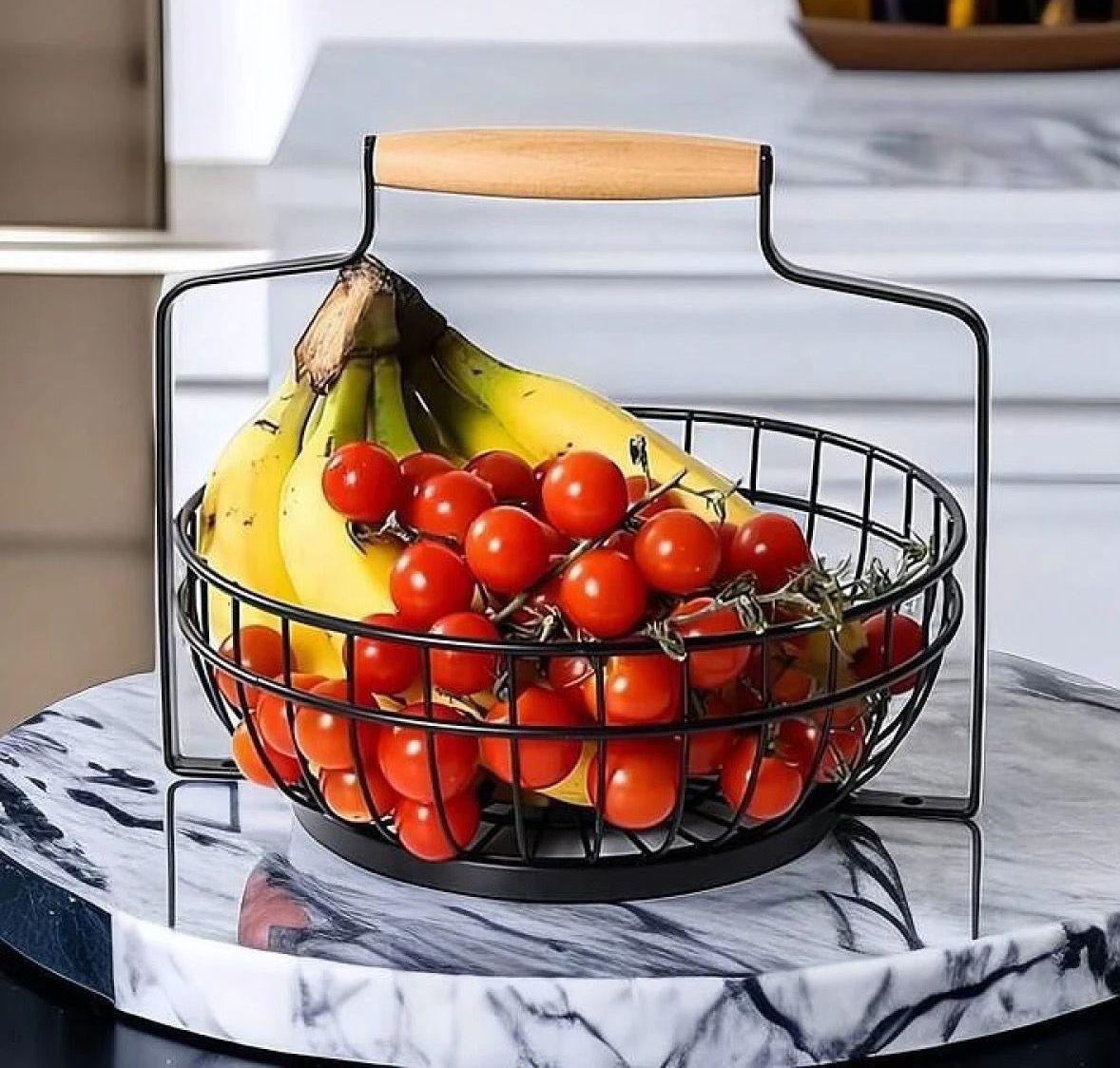 Frutera metálica mango madera, diseño simple y moderno que acompaña cualquier cocina. Frutera Metálica Largo 27cm x Alto 25cm