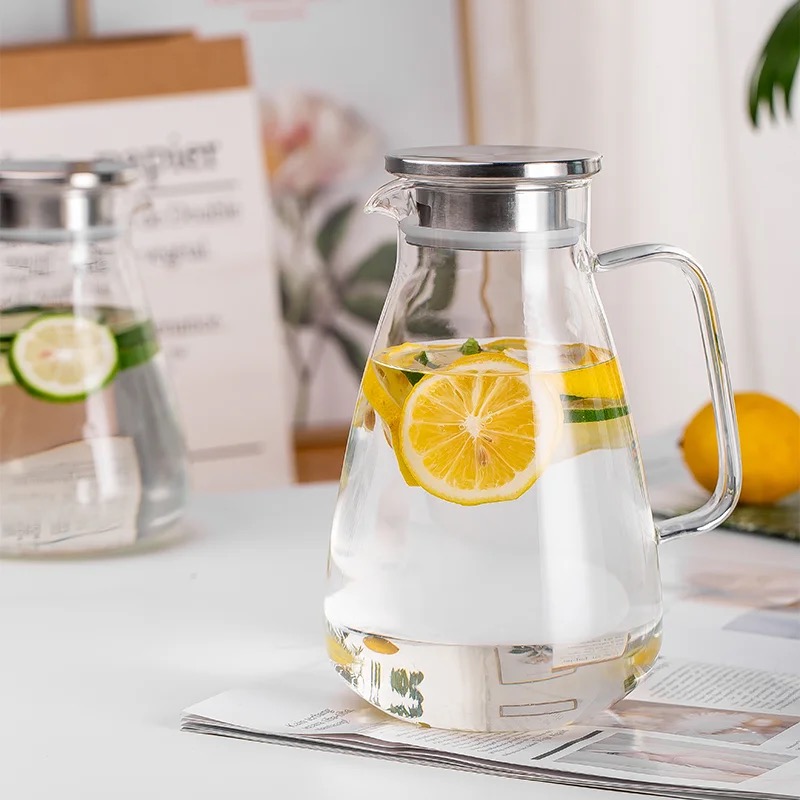 Jarra de vidrio Borosilicato de alta resistencia a los cambio de temperatura con tapa hermética de acero inoxidable. Capacidad: 2200ml