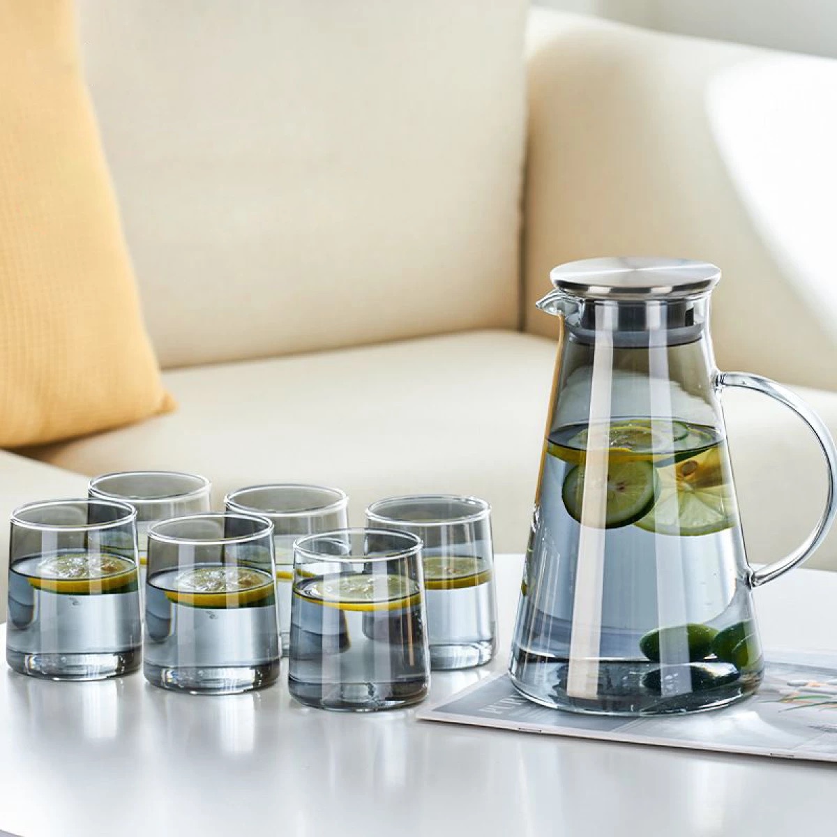 Set de jarra y 6 vasos de vidrio elegante y contemporáneo. Capacidad: Jarra 1,8L Vasos 300ml Viene en varios tonos: Gris Tornasolado Transparente y Ambar.