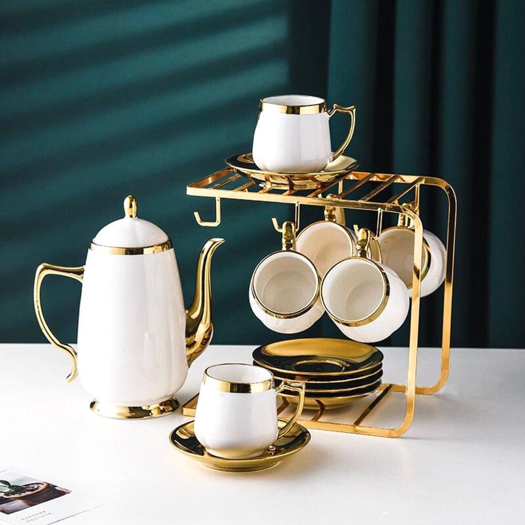 El "Juego de té Russell" es la elección perfecta para disfrutar de tus momentos de té o café con estilo y elegancia. Con una tetera de 1.2L y 6 tazas de 210ml, este juego completo también incluye 6 platillos, un soporte de metal y una bandeja de cerámica. Disponible en 4 tonos Blanco, Rosa, Gris y Verde. Añade un toque de sofisticación a tus reuniones.