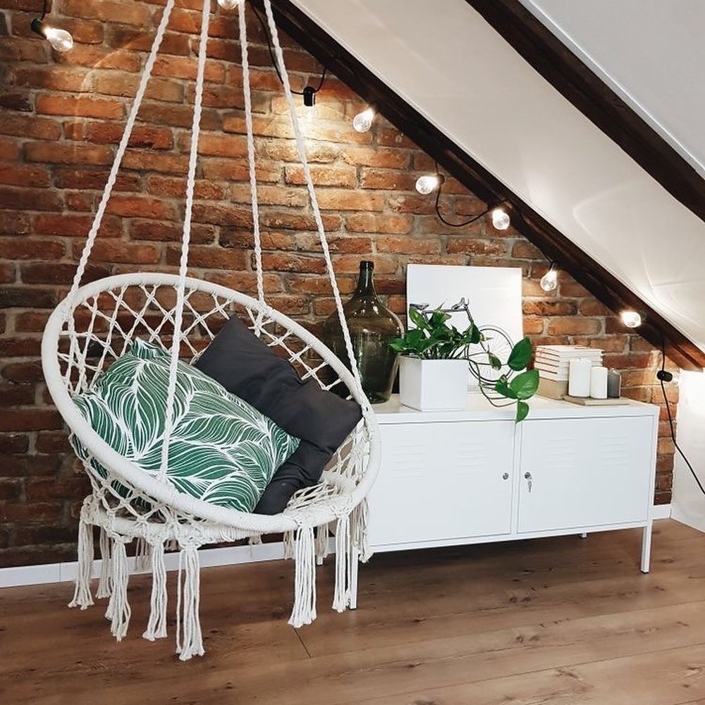 Hamaca de macramé con estructura de metal. Ideal para patio, balcón o terraza y hasta para espacios interiores.